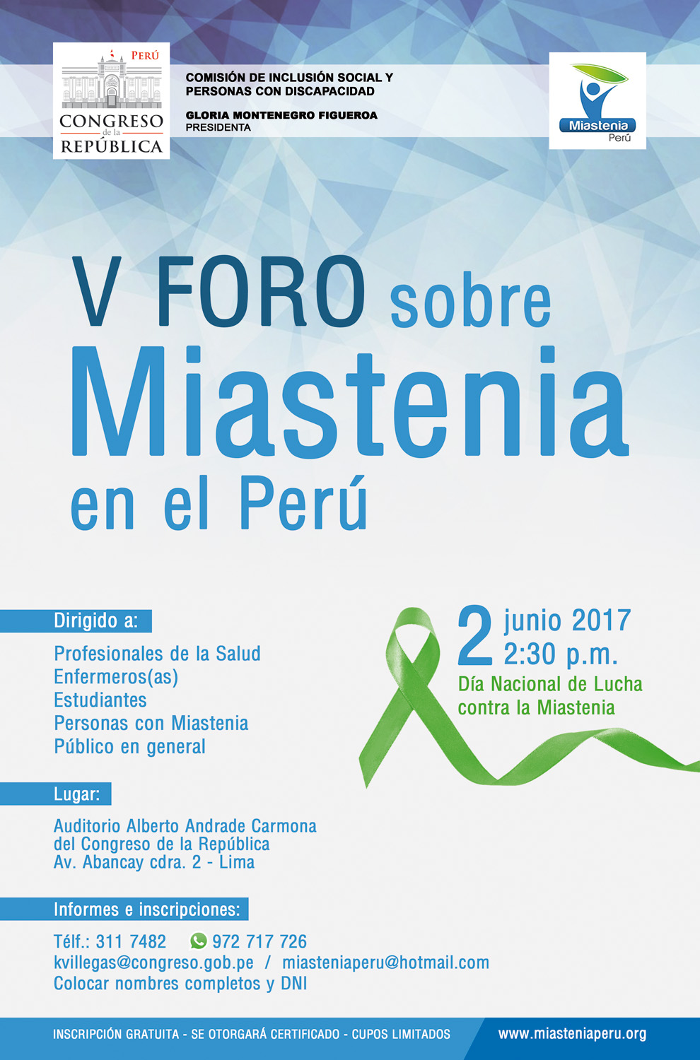 La Asociación Miastenia Perú, entidad que reúne los esfuerzos y esperanzas de personas con Miastenia, comprometidos todos en la búsqueda de una mejor calidad de vida para quienes hemos sido afectados por esta enfermedad, invita a nuestro V FORO SOBRE MIASTENIA EN EL PERU organizado por nuestra institución en el marco de conmemorarse como cada año en nuestro país el “Día Nacional de La Lucha Contra La Miastenia – 2 de Junio”.